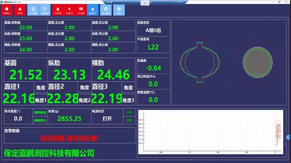 10)测量数据“超差”、测径仪温度“超温”、风机压力过低自动报警功能。