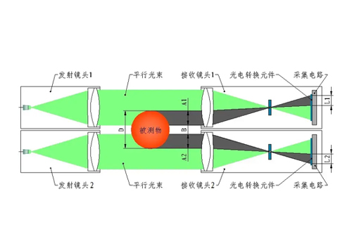 图中2套发射镜头分别发射出平行光射向2套接收镜头,通过接收镜头内的透镜使平行光束在光电转换元件CCD芯片上成像。当2束平行光内放入被测物时,在光电转换元件的像上就会出现阴影,设其宽度分别为L1、L2。经过对光电转换元件发出的电信号的处理和计算可以得出L1、L2所对应的尺寸A1、A2,A1加A2再加上两个镜头之间的净间距B即可得出被测物的尺寸D。
