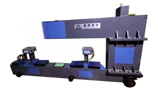 该设备共设置2只二维激光测量传感器和2只激光位移传感器。二维传感器设置在两侧,可根据板材厚度调整传感器之间的间距,间距调整由伺服电机驱动滑台模组实现,调整完成后不需校准即可实现高精度测量。位移传感器固定设置在被测板材的上、下方,测量板材中间点的厚度。
