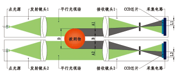 当被测物通过2束平行光视场时,将在两个接收镜头的CCD芯片上分别形成宽度为L1、L2的阴影。