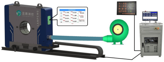 主控室液晶显示器:管材截面的最大/最小直径、平均值、椭圆度;方钢边长、对角等尺寸;各路测头的分项测量值;设定的钢管长度、速度、标称直径、上下公差等;尺寸波动趋势预报(输入钢管长度和速度后可以对应外径在管材的位置),缺陷分析曲线。