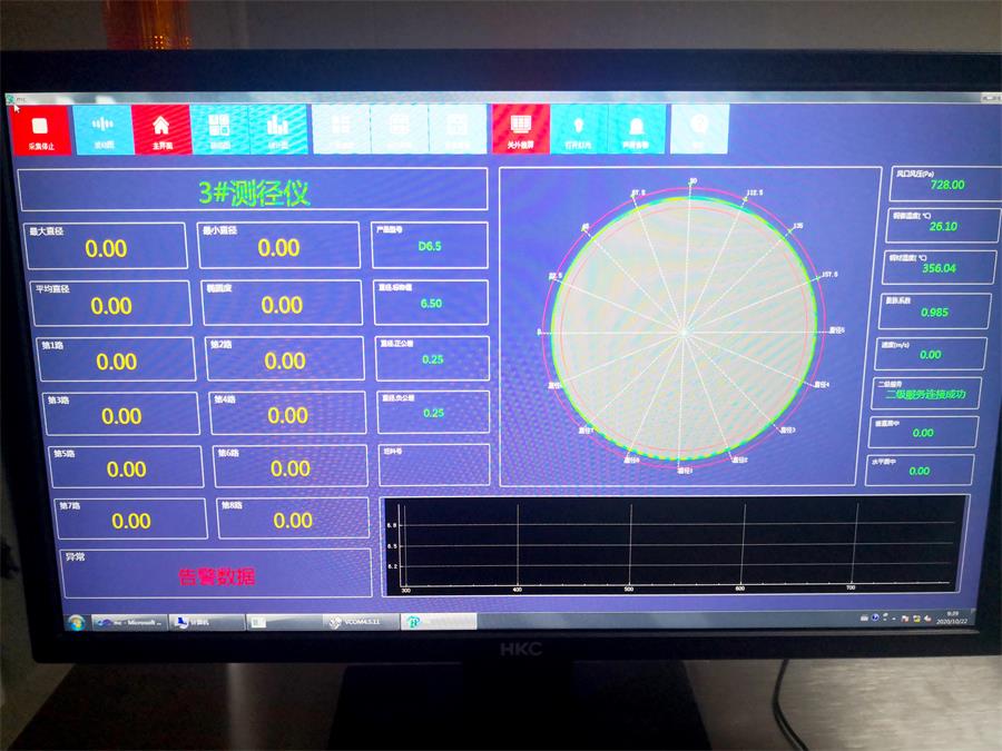 智能测量仪安装在生产线进行在线检测,检测的数据实时显示,每次检测到不合格品时,及时给出信号,进行声光报警提示。